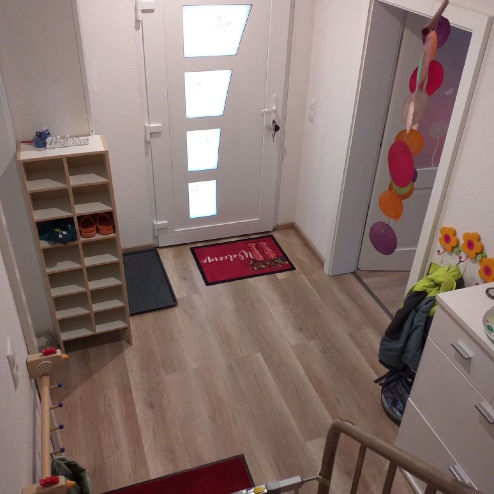 Kinder haben besondere Bedürfnisse an die Einrichtung: Für den Mittagsschlaf oder um sich auszuruhen gibt es den Schlafbereich mit einer eigenen Matratze für jedes Kind. Durch den Sternenprojektor wirkt der Schlafbereich besonders kuschelig. Gewickelt wird auf einer geeigneten Wickelunterlage am Boden- aus Sicherheitsgründen. Um die notwendige Hygiene zu gewährleisten bringt jedes Kind sein eigenes Handtuch mit. Die Küche ist besonders wichtig: hier nehmen wir gemeinsam die Mahlzeiten ein und lassen es uns zusammen am großen Tisch schmecken. Gebastelt werden kann am Küchentisch oder am kleinen Tisch im Wohnzimmer – manche Bereiche werden auch für verschiedene Anlässe umgeräumt. Da ich Nichtraucherin bin sind natürlich alle Räume rauchfrei.